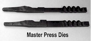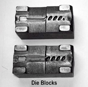 Background As the reader may be aware, conventional spring swages were used in Germany to make early web & wire corkscrew helixes but drop hammer cold forging techniques were also employed. A splendid gift from Klaus Pumpenmeier has resulted in this article - in fact this was also Ron's "Best Six" submission for the year 2002. A mid 20th century German drop hammer forging die set/Gesenk from the family firm, August Hoppe & Söhne in Merschied, Solingen. This small factory, which manufactured only corkscrew helixes, was located down a laneway behind their home. Each die component (7 in total) is the exact shape for each function required to forge a specific pitch wire helix (7.3cm12 15/16" long). This tool set (total weight 3305 gm / 7lb 7oz) was used to manufacture a wire helix for pocket knives and comprises: ![]() 2. Two hardened master press dies (made from old files) also
